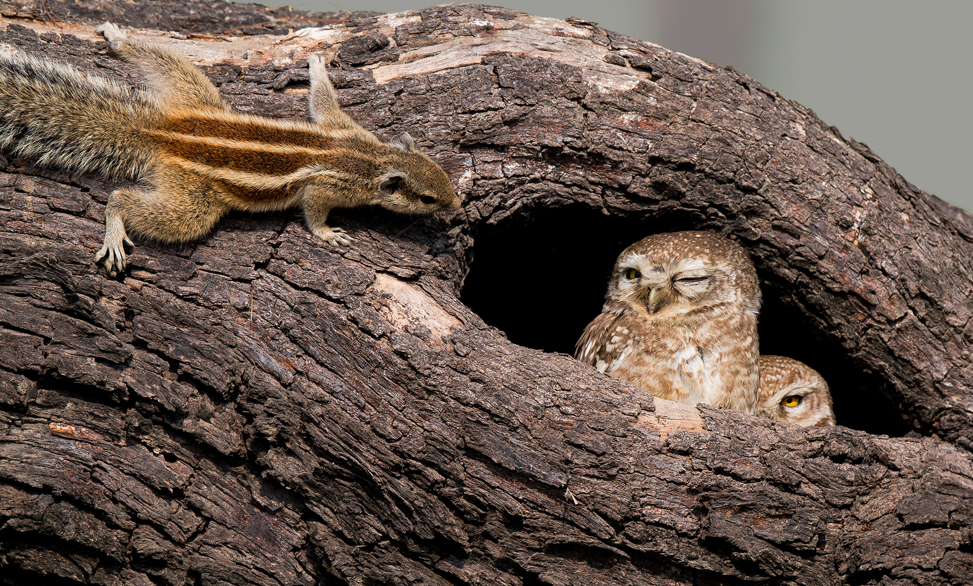 Photographed in Bhigwan where a pair of Spotted Owlet have made a fallen wooden log as its home. The Squirrel made a surprise knock at the door and met the hunter..
